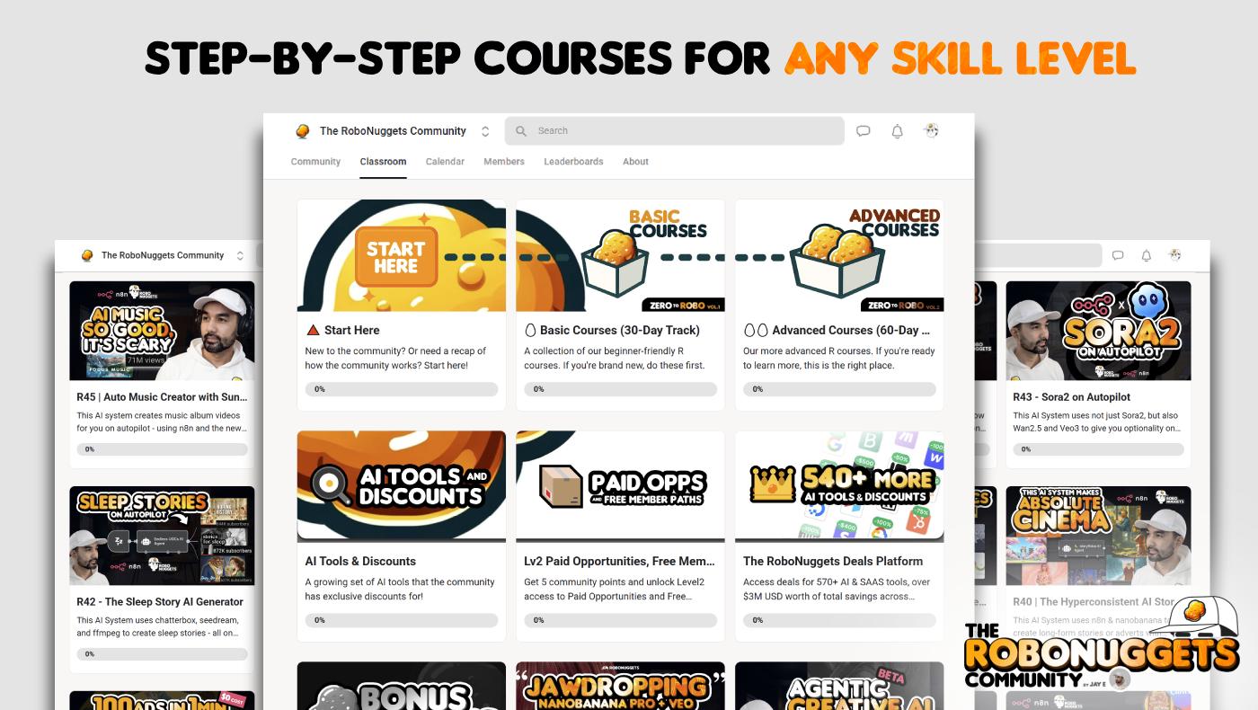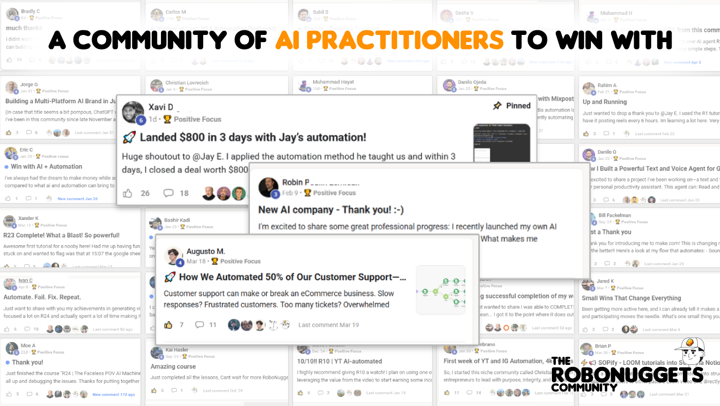 RoboNuggets focuses on clear execution: learn the tools, build workflows, ship projects, and connect with other practitioners doing the same.